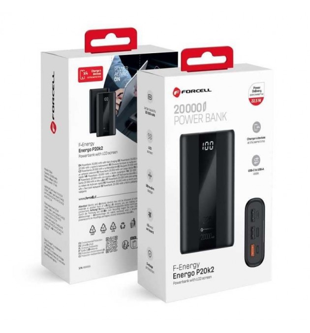 La Forcell F_ENERGY P20K2 est une batterie externe performante et fiable, pensée pour les utilisateurs nomades. Sa capacité de 20 000 mAh permet plusieurs recharges complètes des smartphones et tablettes, idéale pour les voyages ou une journée chargée.