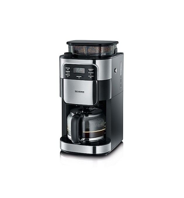 ka4810 - cafetière avec broyeur intégré programmable 15 tasses 1000w - La cafetière programmable Séverin KA4810 est une cafetière filtre avec broyeur. Une machine qui peut être utilisée avec tout type de café en grains ou de café moulu. Moulin intégré avec possibilité de régler la finesse du grain et la quantité de mouture. Ecran LCD avec fonction minuterie pour programmer votre café. Moulin désactivable pour utiliser du café moulu. Fonction Aroma avec 3 niveaux de saveur réglable. Design de qualité avec éléments en inox. Porte-filtre pivotant et amovible 1x4 avec stop-goutte et filtre permanent supplémentaire.