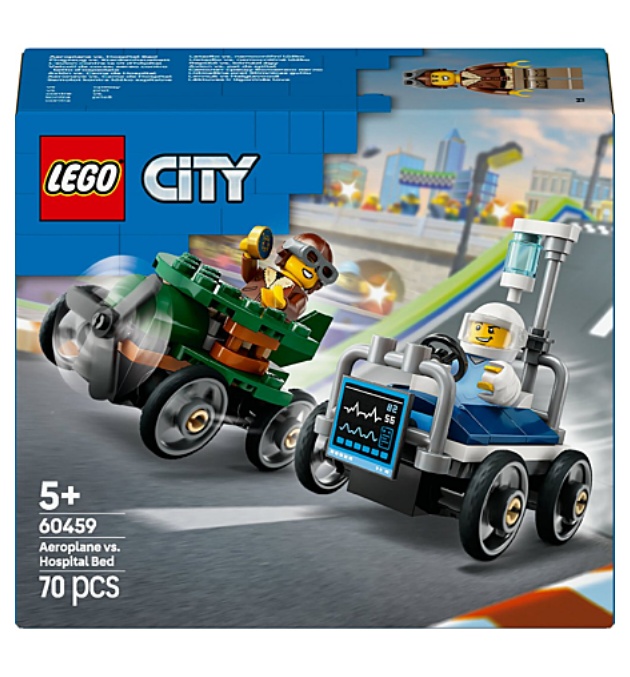 Offrez aux garçons et aux filles, amateurs de course, de 5 ans et plus le Pack de bolides de course : avion contre lit d'hôpital LEGO City (60459). Ce jeu de construction amusant comprend 2 caisses à savon et 2 minifigurines LEGO. Les enfants peuvent organiser des courses entre la pilote à bord de l'avion et le patient dans le lit d'hôpital ultra-rapide. Qui va l'emporter ? Soyez aux premières loges pour assister à des courses urbaines sensationnelles ! Ce jouet avec voitures caisses à savon LEGO inclut des instructions étape par étape imprimées et propose un guide numérique dans l'appli LEGO Builder, qui invite les enfants à zoomer et faire pivoter les maquettes en 3D, à suivre leur progression pendant la construction et à explorer et sauvegarder d'autres sets. Les sets LEGO City incluent de superbes véhicules, des structures réalistes et des personnages amusants et inspirants. Ce set de caisses à savon peut être combiné avec d'autres modèles de la gamme LEGO City (vendus séparément) pour enrichir le jeu. Jouets LEGO City pour jouer et décorer une pièce _ La caisse à savon façon avion de ce set de 70 pièces mesure plus de 3 cm de haut, 6 cm de long et 4 cm de large.