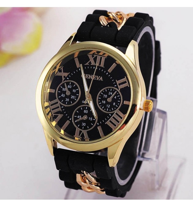 MONTRE GENEVA NOIR CADRAN OR AVEC CHAINE