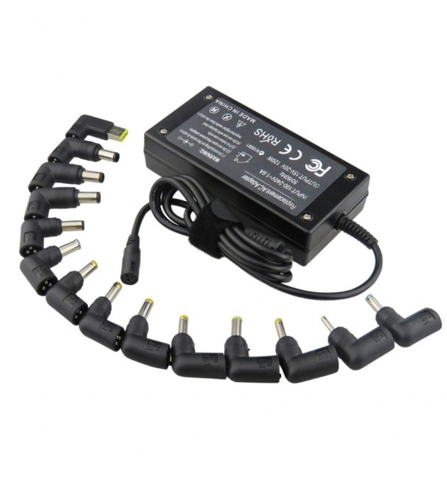 Alimentation universelle PLUGGER PS 120W avec tension automatique de sortie. Livré avec 14 embouts de taille différentes. Compatibles avec de nombreuses marques d'ordinateurs portables.