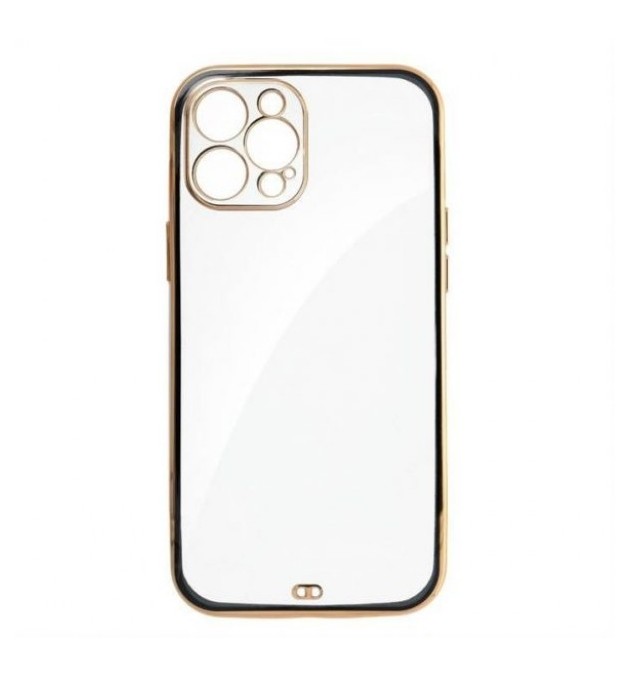 Coque arrière transparente avec un cadre coloré et une bordure dorée.