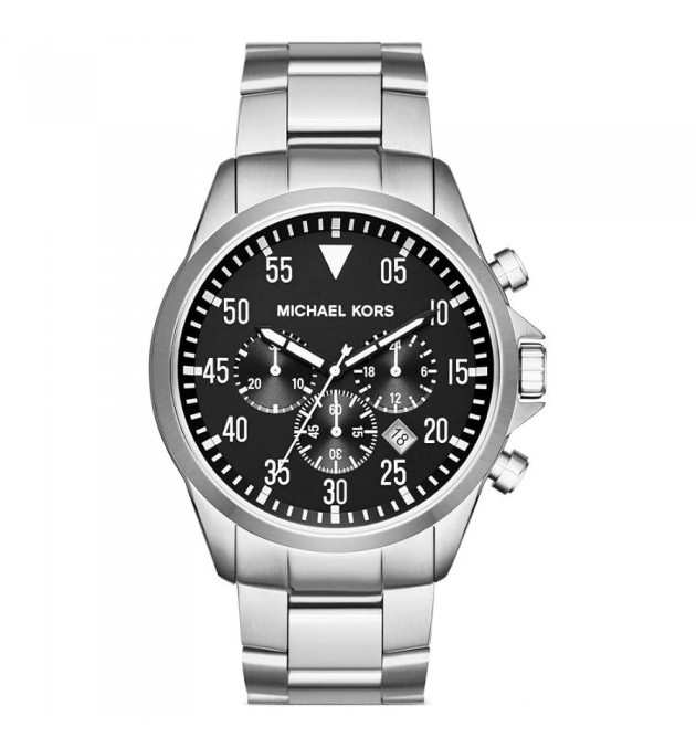Montre MICHAEL KORS homme - Boîtier rond (diam. 45 mm) en acier inoxydable, finition polie et brossée - 2 bouton-poussoirs chromés - Etanche 10 ATM