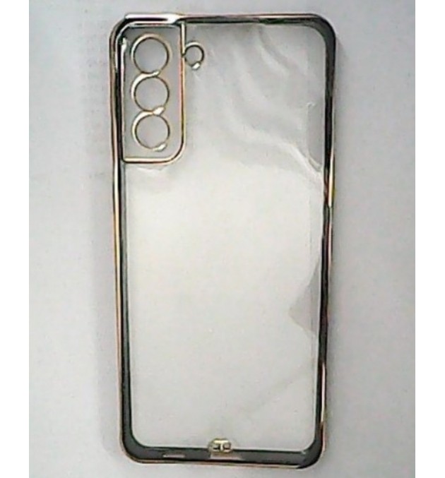 Coque arrière transparente avec un cadre coloré et une bordure dorée.