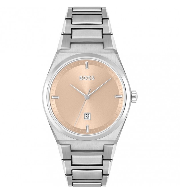 La Montre Hugo Boss STEER 1502670 - Femme se distingue par son allure néo, classique, chic, au top de la tendance actuelle. L'accessoire de caractère est constitué d'un cadran rond au fond or rose brossé soleil renfermant trois aiguilles, des index en bâtonnets et un quantième guichet en acier lisse et brillant. La conception contrastée offre de l'allure et assure une facilité accrue dans la lecture des indications. Le bracelet garantit un maintien ferme et confortable tout en habillant votre poignet avec raffinement.