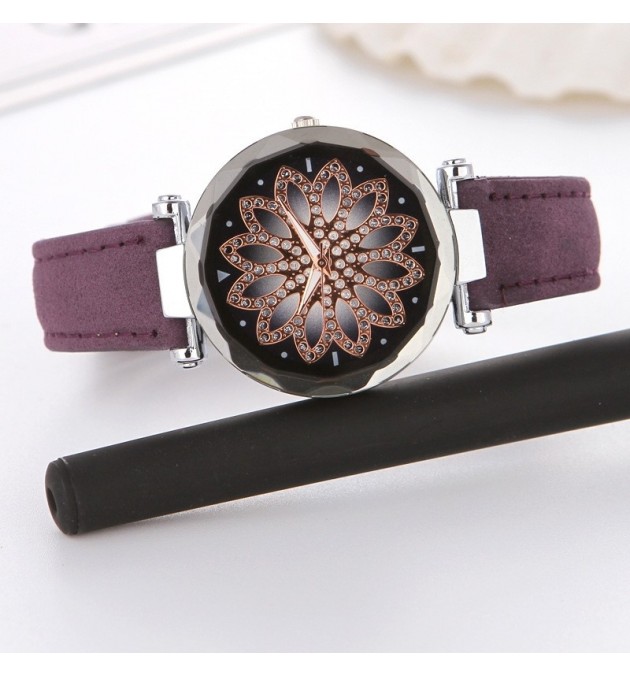 MONTRE NONAME VIOLET CADRAN FLEUR NOIR ET OR ROSE