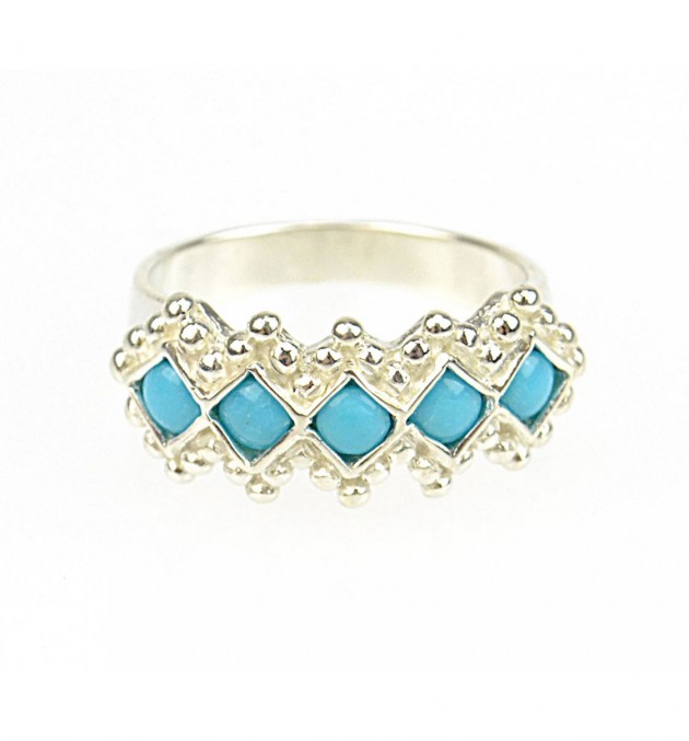 Bague turquoise ornée de 5 véritables turquoises montées sur argent 925/1000