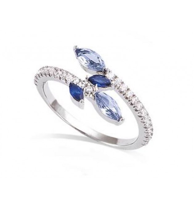 BAGUE EN ARGENT 925 RHODIE TOI ET MOI OXYDES VERRE BLEU SAPHIR ET AQUAMARINE T58