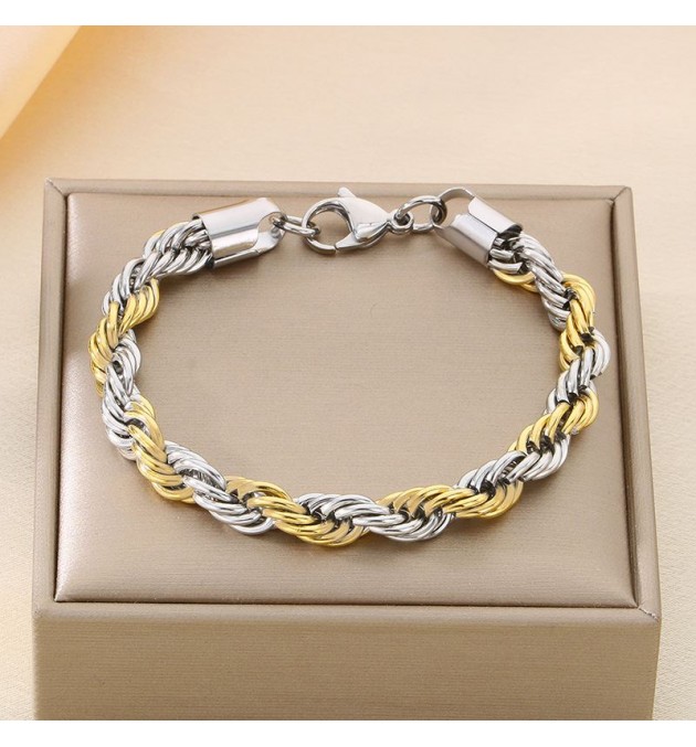 BRACELET ACIER MAILLE TORSADE GRIS ET DORÉ 20CM