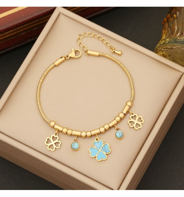 BRACELET ACIER DORE TREFLE BLEU ET DORE 15CM/20CM