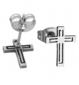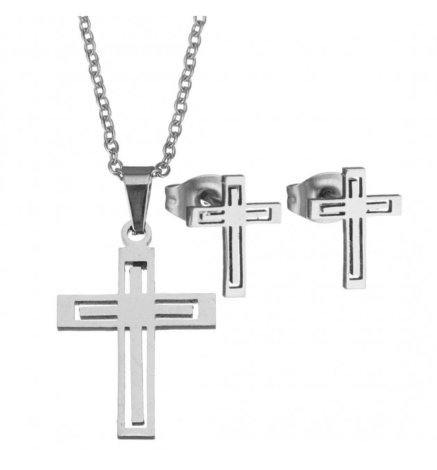 COFFRET COLLIER CROIX DOUBLE AVEC BOUCLE D OREILLE ACIER