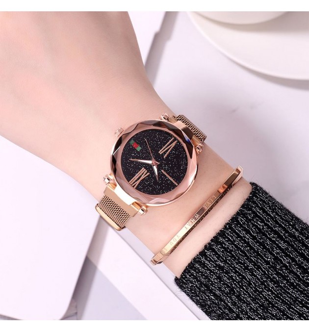 MONTRE NONAME CADRAN NOIR BRACELET OR ROSE SIGNE VERT ET ROUGE