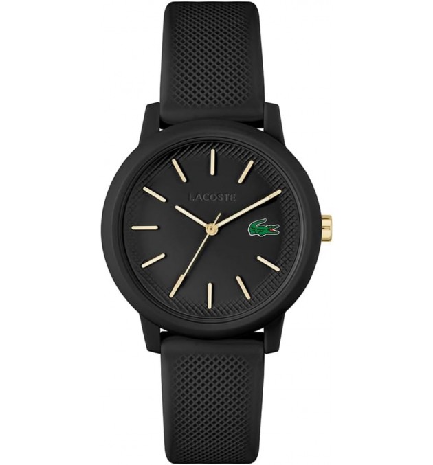 Cadran noir semi-brillant avec des touches d'or et logo emblématique LACOSTE à 3 heures