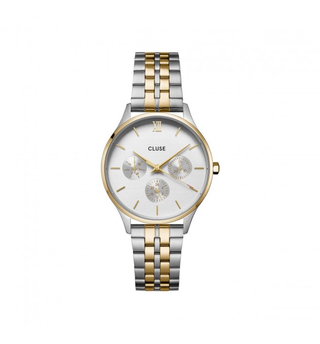 MONTRE CLUSE, Minuit Multifunction, femme, mouvement quartz, boîtier acier inoxydable, cadran blanc, bracelet acier inoxydable bicolore. Étanche 5 ATM.