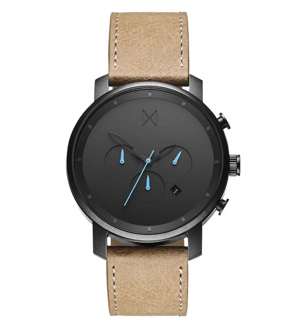 Cette montre MVMT à un boîtier en acier inoxydable avec un diamètre de 45mm et possède un bracelet en cuir. Le boîtier de la montre contient un mouvement et un cristal minéral.